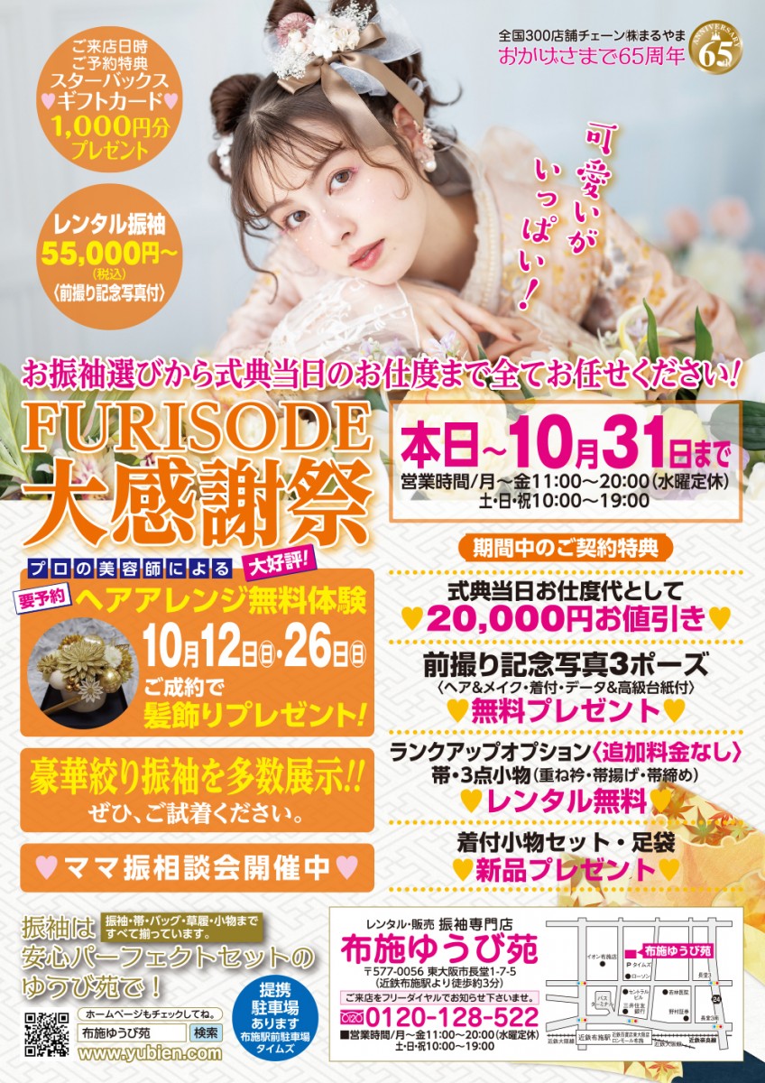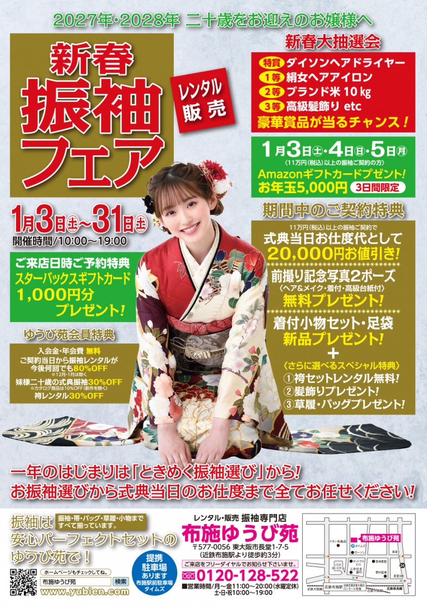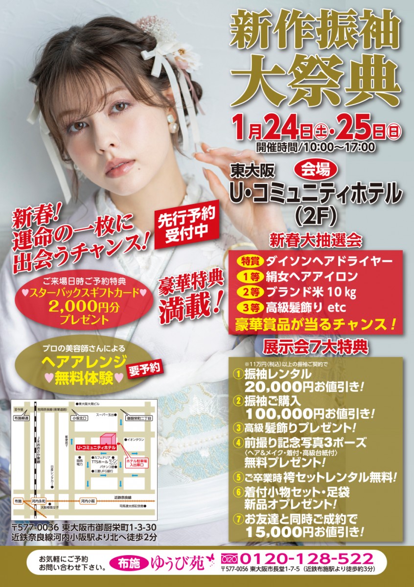 布施ゆうび苑です。地域密着の振袖専門店で レンタル・ご購入どちらも安心のフルセットプランをご用意しております。